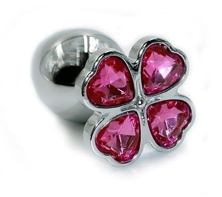 Анальная пробка из алюминия размер S. Страз в форме четырёхлистного клевера выполнен из стекла розового цвета. Упакована вельветовый мешочек для хранения.